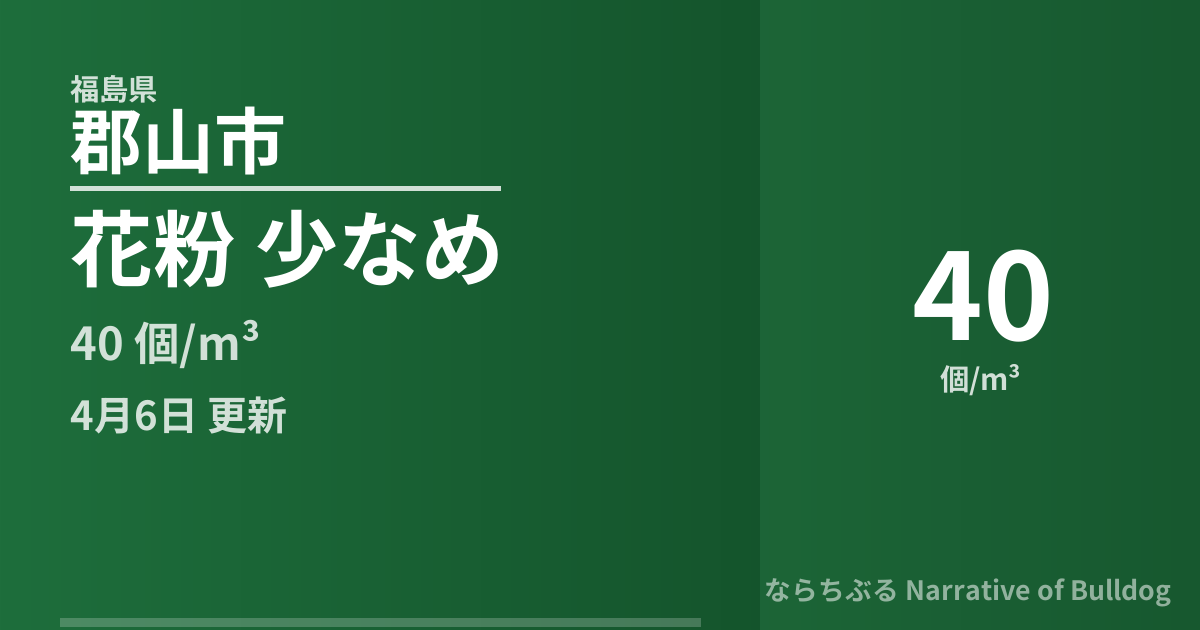このページでは、福島県郡山市の花粉飛散情報をリアルタイムで提供しています。 データは観測地点の自動計測機器から1時間ごとに取得・更新されており、当日の累計飛散量と翌日予測を確認できます。