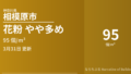 花粉の実測データは1時間ごと(6〜18時)に自動更新されます。 「今日の累計花粉量」は当日0時から現在までの積算値です。 翌日予測は前日実績・過去データ・気象情報をもとにアルゴリズムで算出しています。