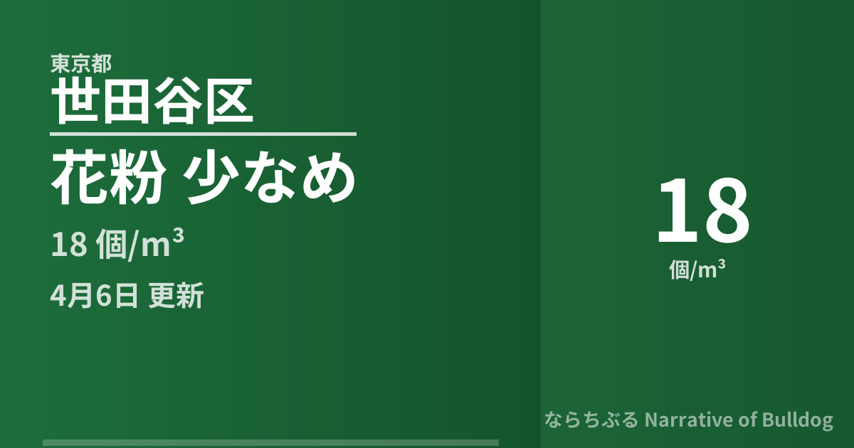 このページでは、東京都世田谷区の花粉飛散情報をリアルタイムで提供しています。 データは観測地点の自動計測機器から1時間ごとに取得・更新されており、当日の累計飛散量と翌日予測を確認できます。