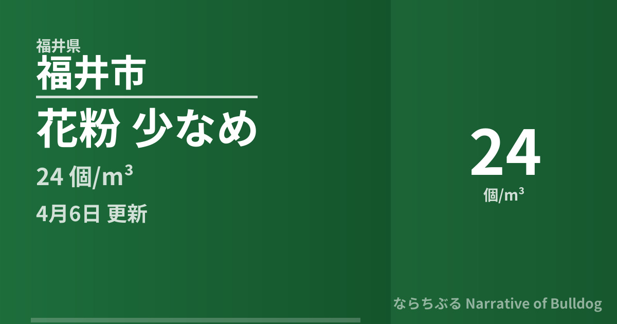 福井市の本日(4月6日)の花粉飛散量は「少ない」レベルです。