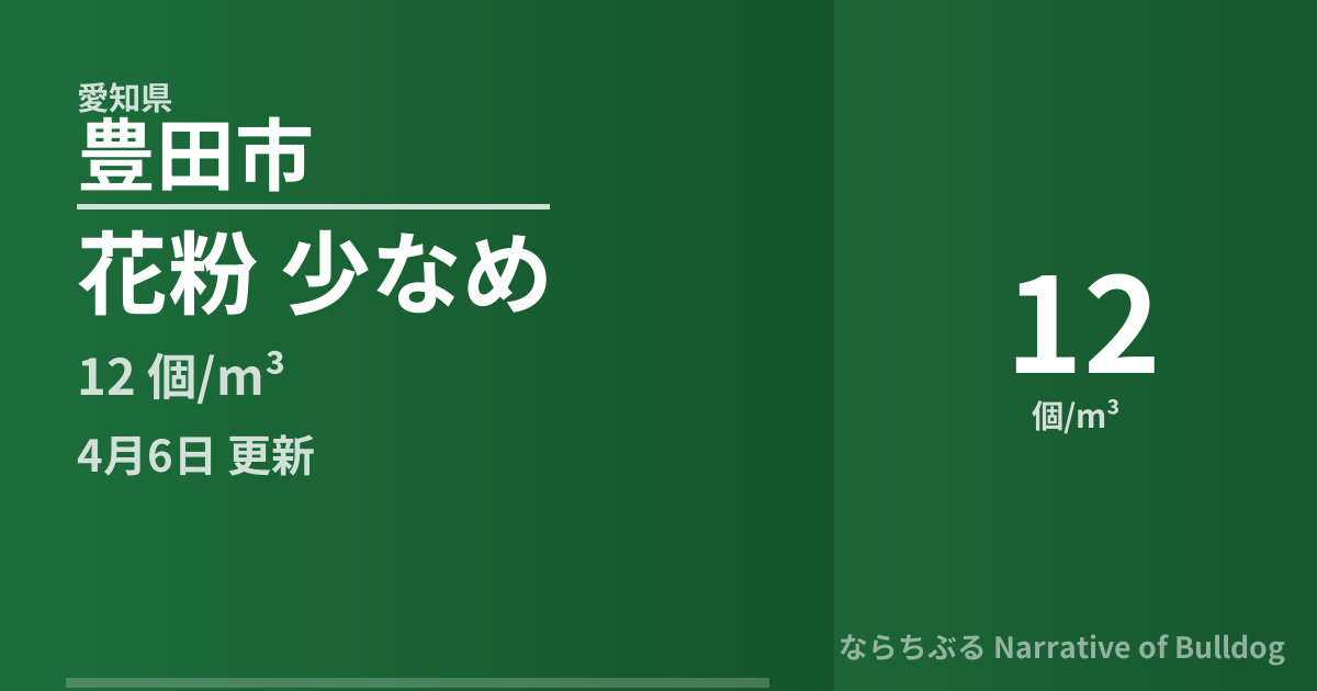 このページでは、愛知県豊田市の花粉飛散情報をリアルタイムで提供しています。 データは観測地点の自動計測機器から1時間ごとに取得・更新されており、当日の累計飛散量と翌日予測を確認できます。
