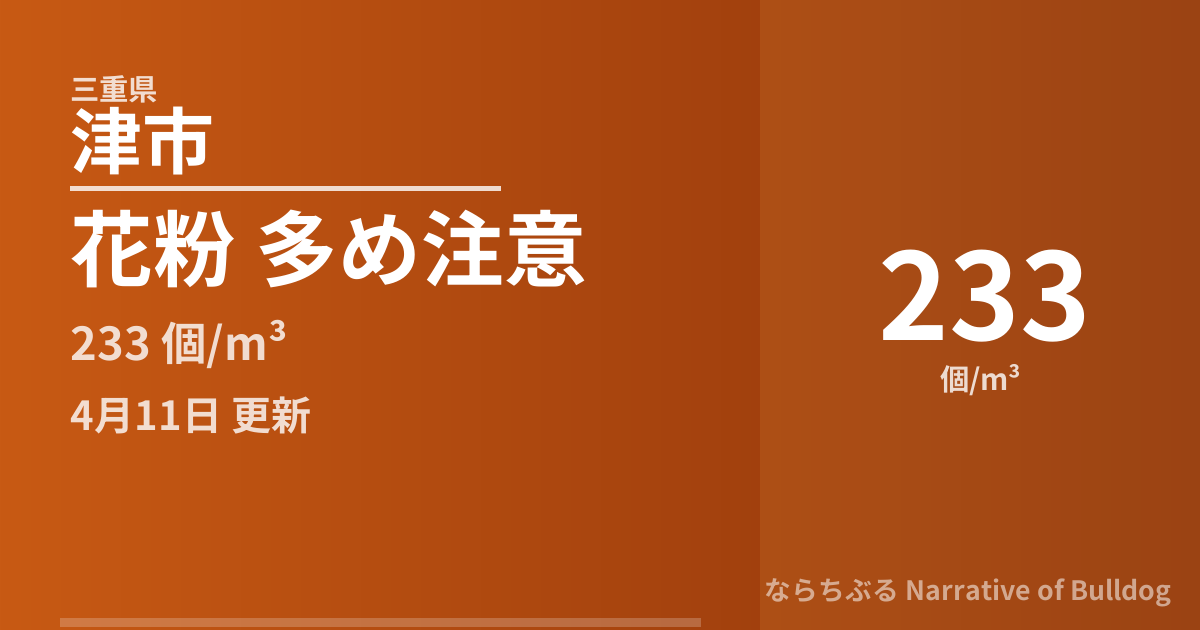 津市の本日(4月11日)の花粉飛散量は「多い」レベルです。
