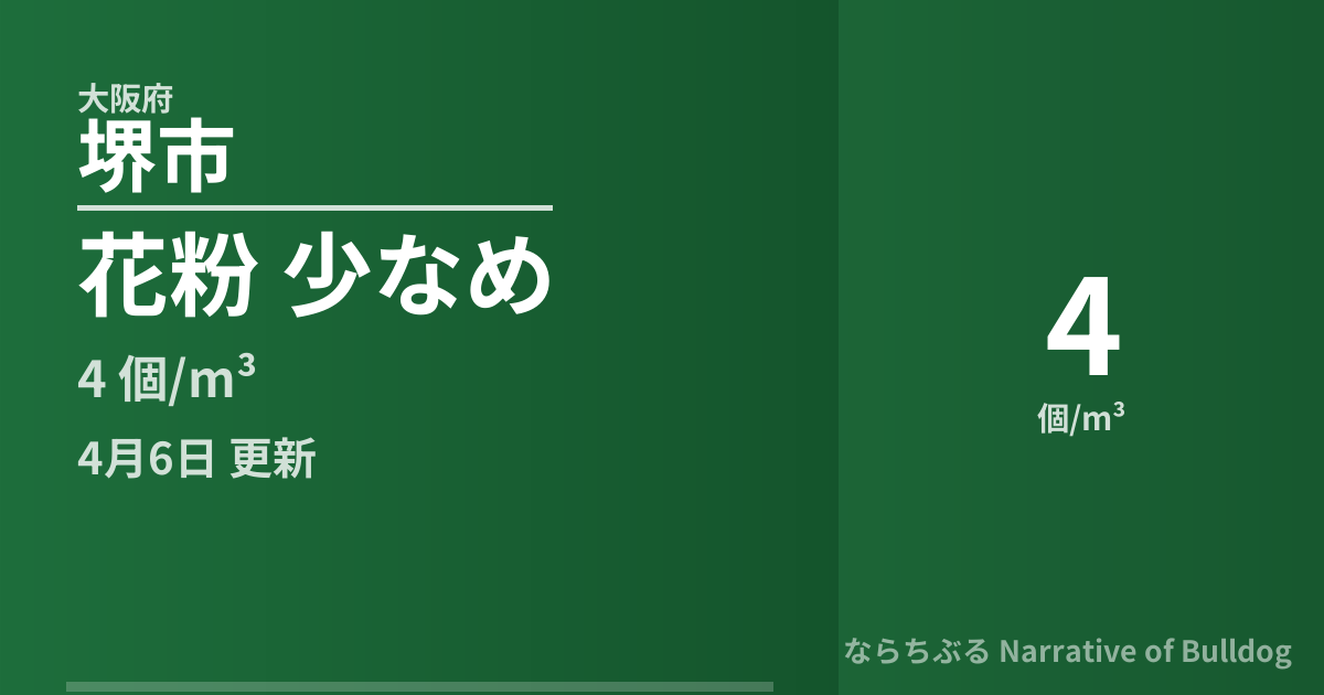 このページでは、大阪府堺市の花粉飛散情報をリアルタイムで提供しています。 データは観測地点の自動計測機器から1時間ごとに取得・更新されており、当日の累計飛散量と翌日予測を確認できます。