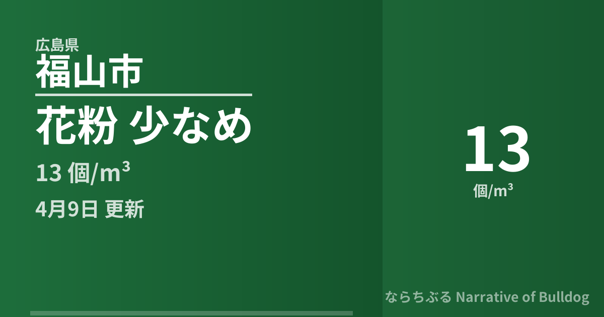 福山市の本日(4月9日)の花粉飛散量は「少ない」レベルです。