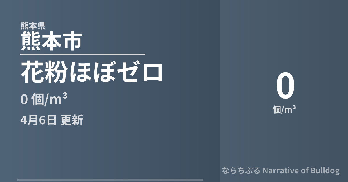 熊本市の本日(4月6日)の花粉飛散量は「ほぼなし」です。