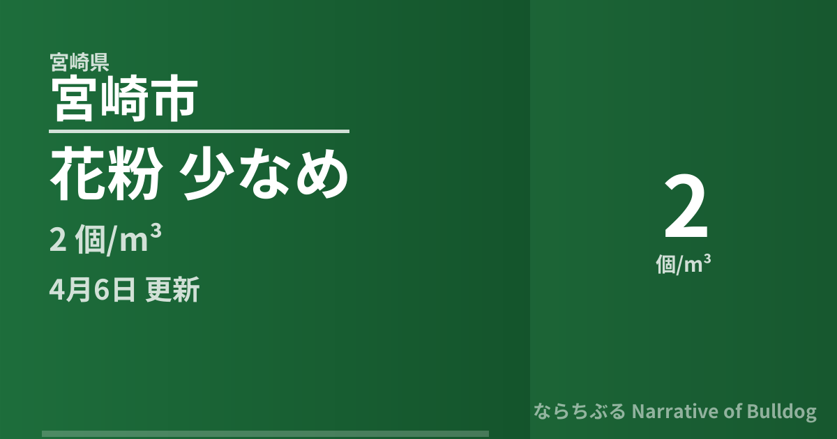 このページでは、宮崎県宮崎市の花粉飛散情報をリアルタイムで提供しています。 データは観測地点の自動計測機器から1時間ごとに取得・更新されており、当日の累計飛散量と翌日予測を確認できます。